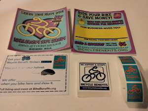 Comes with 10 all weather Bike Benefits program helmet stickers @ $2.50 each, 2 window decals showing participation/Bike Benefit program description, 1 small decal for the cash register (or place where you want people to see it but don't have a lot of room), and 1 index card which explains the program and encourages point of purchase sticker sales. Please include under "comments" if you need additional materials.